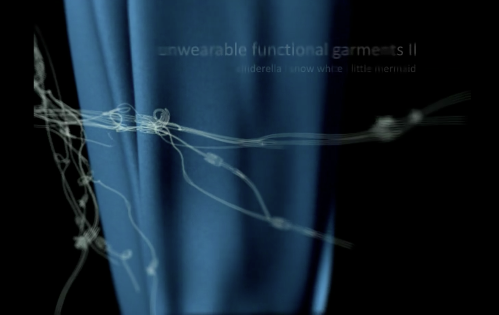 Unwearable functional garments II: for three princesses is a single channel 3-d animation based on portraying the redesigned and reconstructed garments for three princesses: The Little Mermaid, Snow White, and Cinderella. They are the fairy tale characters who have their own dilemmas. The motion of fabric and design of garments reflect their predicaments and longings. The garments are synthetic and unwearable, but simultaneously they are delivering their fervent perplexity through artificial organic forms and gestures. Each garment is expanding and contracting. They are inhaling and exhaling, and floating and emitting. I specifically conceptualize the sentimental aspects of the stories. The sound track starts with a voice of little child from the classic opening words, “once upon a time…,” and gradually reveals the part of the stories we have hardly paid attention to. I chose excerpts from the sentences and words that manifest the crucial contents of the each fairy tale. In this piece, I re meditated the sorrow and serenity of the stories by manipulating imagination.